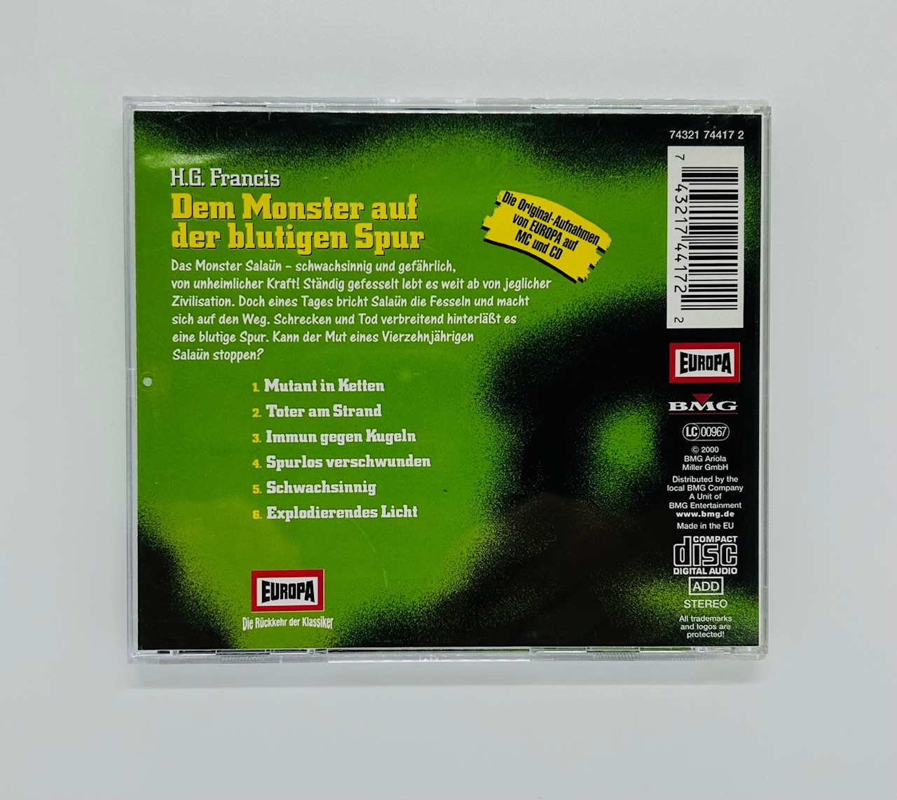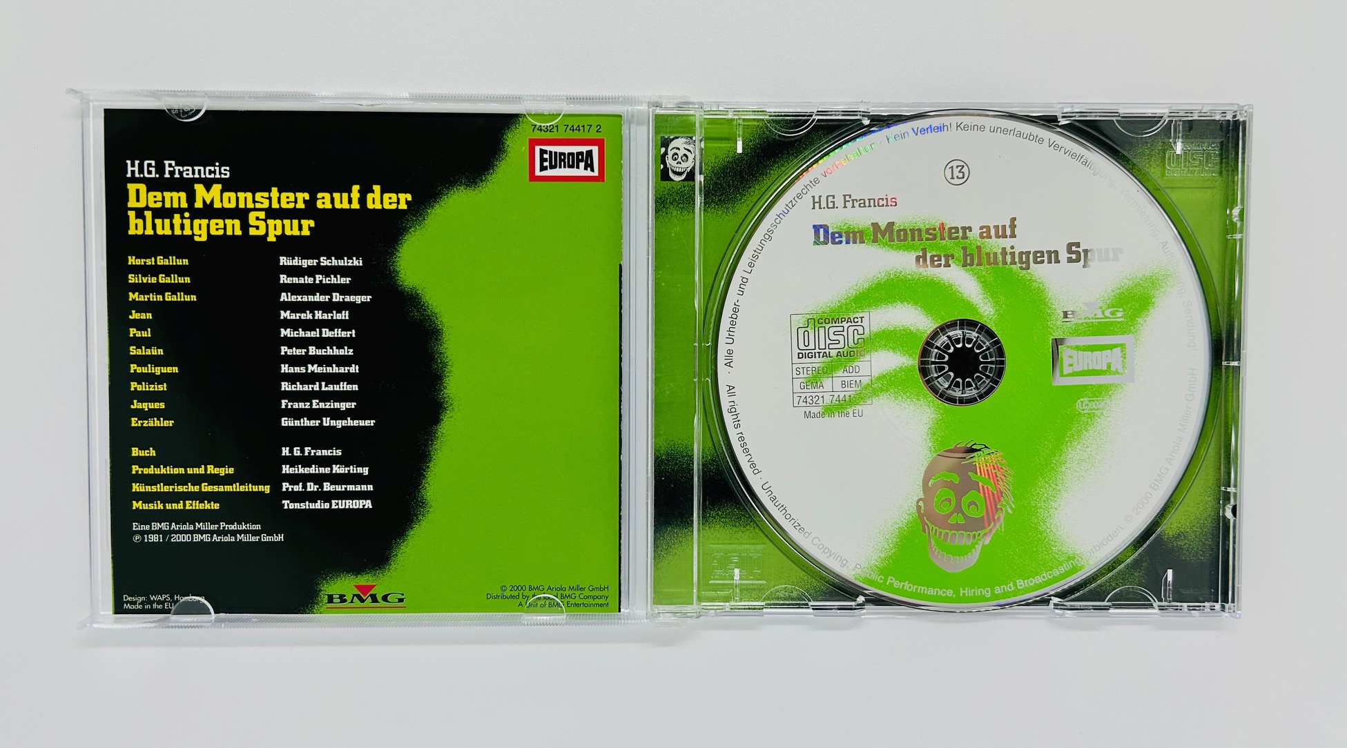 Die Folge Dem Monster auf der blutigen Spur ist die 13. Folge der beliebten Gruselserie von H.G. Francis, einem deutschen Autor und Hörspielmacher. Die Gruselserie, die in den 1980er Jahren populär war, umfasste verschiedene, oft unheimliche und mysteriöse Geschichten, die für Jugendliche und Erwachsene produziert wurden. Jede Folge ist in sich abgeschlossen und behandelt unterschiedliche Themen aus dem Horror- und Science-Fiction-Genre.