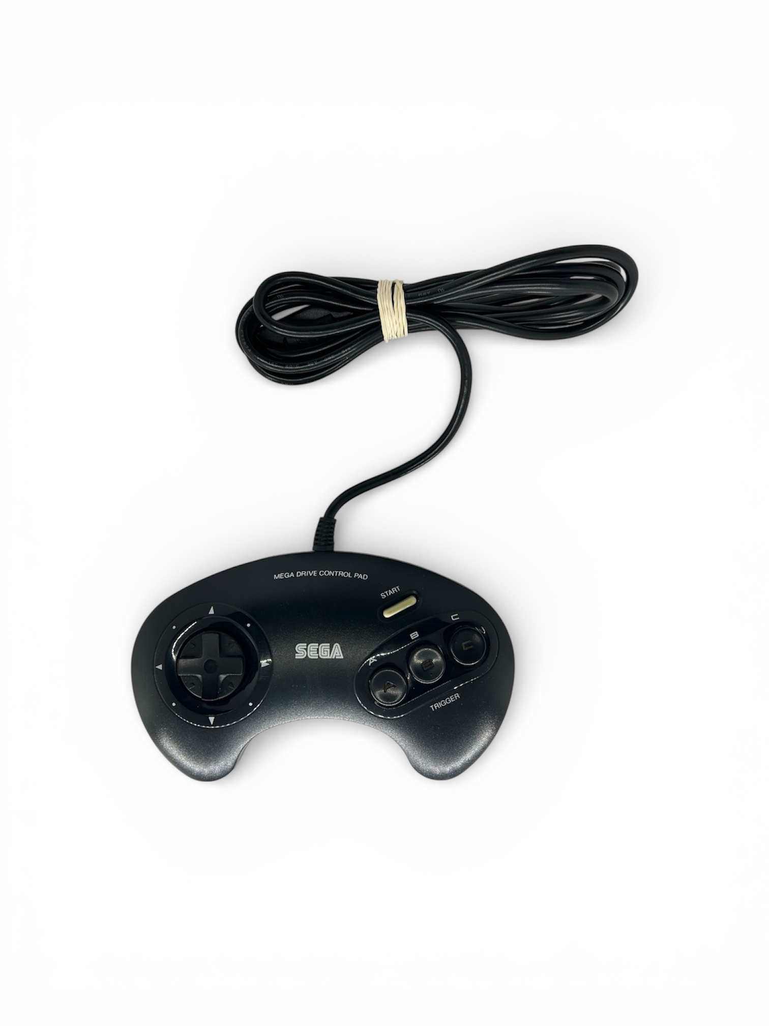 Der Mega Drive Control Pad ist der offizielle Controller für die Sega Mega Drive. Der Controller hat ein markantes, halbkreisförmiges Design, das ergonomisch gestaltet ist, um gut in den Händen zu liegen. Der Controller wird über ein Kabel mit einem 9-poligen Stecker an die Konsole angeschlossen. Der Controller ist für längere Spielsitzungen ausgelegt und bietet eine komfortable Handhabung für verschiedene Spielgenres.