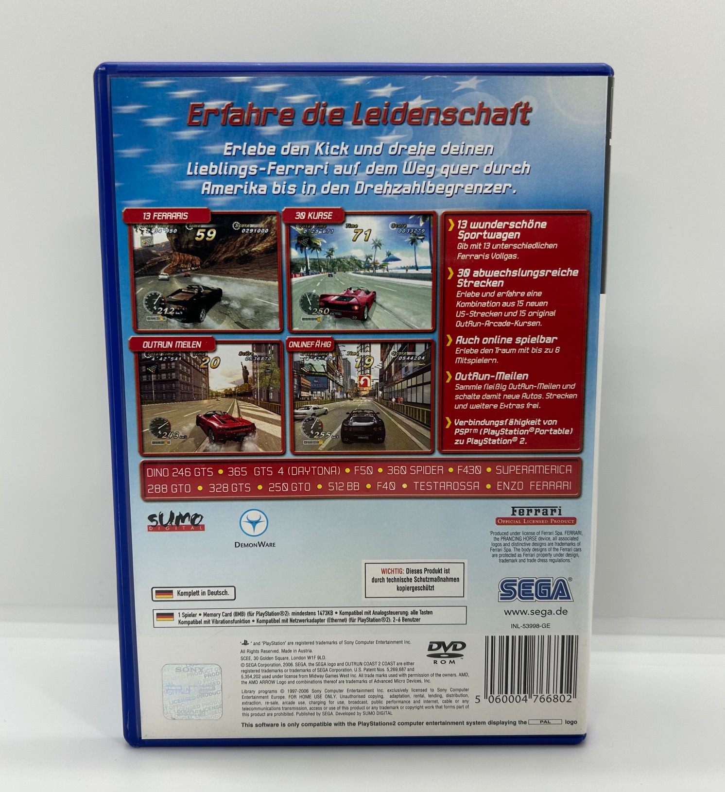 Erlebe pure Arcade-Racing-Action mit OutRun 2006: Coast 2 Coast auf der PlayStation 2 einem der beliebtesten Rennspiele seiner Generation. Entwickelt von Sumo Digital und veröffentlicht von SEGA, kombiniert das Spiel klassisches OutRun-Gameplay mit modernen Features und umfangreichen Inhalten. Steige in legendäre Ferrari-Sportwagen und rase quer durch abwechslungsreiche Landschaften von sonnigen Küstenstraßen bis hin zu kurvigen Bergpässen. Dein Ziel: Geschwindigkeit, Style und das perfekte Fahrerlebnis.