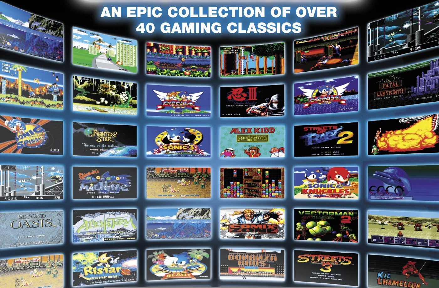 Über 40 Spiele auf einer Disc – darunter Sonic the Hedgehog, Golden Axe, Streets of Rage, Columns, Ecco the Dolphin und viele mehr…