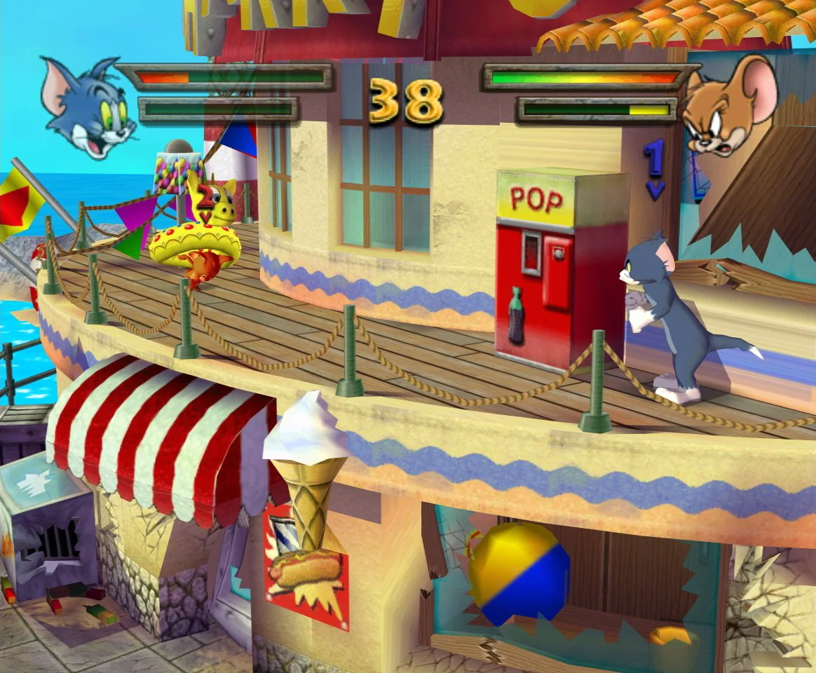 Tom & Jerry War of the Whiskers, dass Spiel ist ein arena-basiertes Kampfspiel, in dem Charaktere aus dem Tom-und-Jerry-Universum gegeneinander antreten. Umgebungen sind zerstörbar und mit interaktiven Elementen ausgestattet. Es gibt mehr als 75 Waffen und Utensilien, die man in den Arenen aufheben und einsetzen kann. Man kämpft nacheinander gegen andere Charaktere; am Ende stehen Bossgegner (z. B. Monster Jerry oder Robot Cat) an.